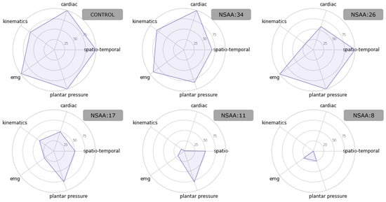 Spider plots of the predicted scores for a control subject and 5 DMD patients with different levels of affliction. As the NSAA scores decrease, so do the scores. However, these reductions are not uniform among categories, being highly dependent on the subjects.
