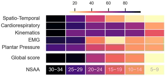 Progression of the multicategory score and global score for different NSAA severities. The color bar represents the normalized averaged scores for each one of the NSAA ranges, as well as for the normalized NSAA. For high NSAA values (30–34), scores are the highest and progressively decrease until lower NSAA values (5–9). All of these decreases are not linear, indicating that each category is impacted at a distinct stage of the disease’s development.