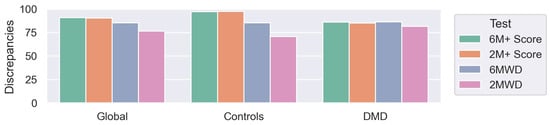 The NSAA scale was taken into consideration as the gold-standard. Figure 7 shows the global differences (discrepancies, resulting from computing Equation (1)) between the pathological scores (2M+ and 6M+) and 6MWD and 2MWD in comparison with NSAA). The 6M+ and 2M+ scores represented a higher degree of similarity to the NSAA for the controls compared to the 6MWD and 2MWD tests. For the DMD group, the 6M+ and 6MWD performances were similar (86.00 and 86.30 respectively), while 2M+ was slightly higher than 2MWD (85.03 and 79.68 respectively).