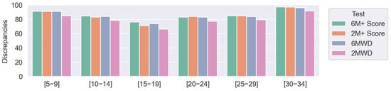Discrepancies for different NSAA ranges, for 6 and 2 min scores (6M+ and 2M+, respectively), 6MWT, and 2MWT in comparison with NSAA score, computed as depicted in Equation (1).