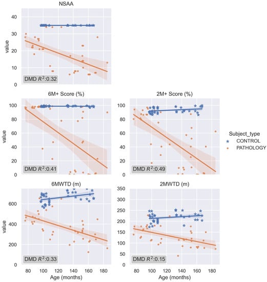 The regression with the ages of the patients is shown in Figure 9. As a progressive disorder, it is expected to have a negative correlation with age. The 6M+ and 2M+ scores were the most negatively correlated with age (with R2 values of 0.41 and 0.49, respectively), with higher values than the NSAA score.