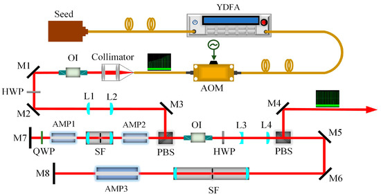 Free-space amplification was arranged in a double-pass amplification layout with three diode-pumped Nd:YAG amplifier modules (0.6 at.% Nd3+ doping). First, two amplifier modules with rod diameters of 3 mm (AMP1, AMP2) were connected to each other in series, and another one with a rod diameter of 6 mm (AMP3) was placed in a separate optical path. The sequence of amplifiers for a pulse traveling within a double-pass configuration is AMP2, AMP1, AMP1, AMP2, AMP3, and AMP3. A group of plane-convex lenses (fL1 = +50 mm, fL2 = +50 mm) was used to relay excellent seed images for initial amplification characterization. Furthermore, the amplified beam diameter was increased to ~2× by means of a combination of L3 and L4 (fL3 = −50 mm, fL4 = +100 mm), with proper matching with AMP3 being realized. An optical isolator (OI), for a peak isolation over 35 dB, was inserted to protect optical elements from being damaged by the reverse feedback beam. To reduce the ASE effect and purify the amplified beam, a spatial filter (SF) was introduced into the double-pass optical path. M1-M6 are presented as 45° reflectors with high-reflectivity (HR) coated at 1064 nm, and M7-M8 served as the 0° reflectors.