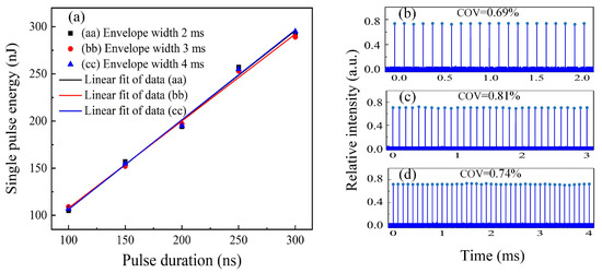 Modulated pulses with different durations were characterized by the energy distribution over the variable envelope width at a 10 kHz pulse frequency, as shown in Figure 3a. The output pulse energy was linearly increased with pulse duration with slope efficiencies of 94.8%, 92.2%, and 95.2%, corresponding to envelope widths of 2 ms, 3 ms, and 4 ms, respectively, due to the growing duty cycle for the injected AWG signal. As a comparison of the same pulse duration, modulated pulses possessed similar energy distribution trends across different envelope widths. Meanwhile, the time-averaged pulse energy increased from 107 nJ at a 100 ns pulse duration to 292 nJ at a 300 ns pulse duration when hte absorbed pump power was 2.43 W below the threshold of the stimulated Brillouin scattering (SBS) effect occurring in the fiber amplifiers. Figure 3b–d illustrate the modulated burst profile distributions over the recorded length of 2 ms, 3 ms, and 4 ms at a 300 ns pulse duration, resulting in COVs within the envelope of 0.69%, 0.81%, and 0.74%, respectively. The weak deviation in the intensity of intra-burst pulses stemmed from periodic oscillations in the AOM’s efficiency determined by independent phases of the AOM RF driver; thus, a stable phase-locked AOM driver could enhance the envelope distribution.