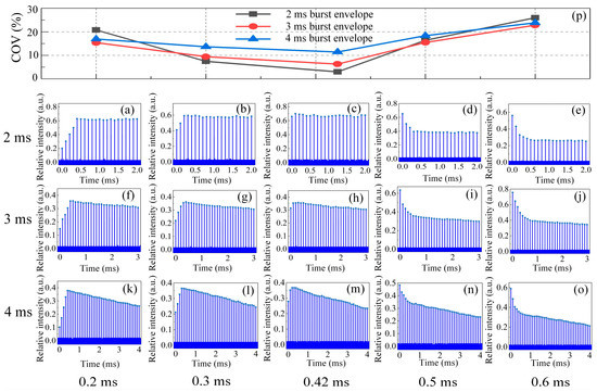 Recorded output burst profile and COV distribution for uniform input at amplification delays of 0.2 ms to 0.6 ms over variable envelope durations: (a–e) 2 ms burst profile; (f–j) 3 ms burst profile; (k–o) 4 ms burst profile; (p) COV distribution versus amplification delay at different envelope durations.