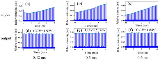 In this work, the Nd:YAG-based modules demonstrated performances endowed with fluorescence lifetime τf = 230 μs, saturation energy density Js = 0.667 J/cm2, pump peak power P = 900 W (AMP1, AMP2), and P = 2500 W (AMP3). Losses of 14.5% (AMP1+AMP2) and 10% (AMP3) were measured before the pulses traveled into the amplifiers, and the loses were 39% (AMP1+AMP2) and 17% (AMP3) after one round trip within the optical cavity. Moreover, the effective beam section could be characterized with thermal lensing via the He-Ne source. Figure 5a–c show the input of a pre-shaped burst profile based on the theoretical method within the 4 ms envelope with a 300 ns pulse duration and in terms of amplification delay from 0.42 ms to 0.6 ms. The input distribution exerted a similar trend with the reverse of the trend exhibited above, thus eliminating the inequilibrium distortion occurring in the 4 ms envelope. The flat-top envelope of the pre-shaped output is presented in Figure 5d–f, corresponding to the COV distributions of 1.92%, 2.14%, and 1.84% within a burst. As a comparison between amplification delay methods, our propose method can effectively enhance the burst profile distribution and improve envelope planeness.