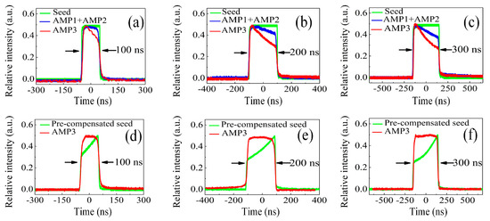 In double-pass pulsed amplifiers, the amplified pulse shape was recorded and investigated at different stages with pulse durations of 100 ns to 300 ns over a 4 ms envelope width and a 10 kHz pulse frequency, as presented in Figure 6a–c. For the square seed pulse, it was found that the pulse profile transitioned from being almost unchanged to subtlely decreasing and then obviously dropping after the first stage (AMP1+AMP2) for pulse durations of 100 ns to 300 ns, respectively. The first parts of the pulse could produce a higher gain, and this gain was depleted as the pulse continued traveling within double-pass amplification because the increased input resulted in more particle consumption occuring on the leading edge. Moreover, there is a significant pulse steepening at the leading edge after the final stage (AMP3), resulting in serious pulse shape distortion. In addition, pulse duration showed no obvious change on the whole. Considering such distortion, the main purpose of the shaping capacity is to counteract the effects of gain saturation in the solid-state amplification chain. The seed profile was solved so that the front end of the pulse profile possessed less energy than that of the latter, thus compensating for gain depletion. The input and output of the pre-shaped flat-top pulse profile is exhibited in Figure 6d–f for pulse durations from 100 ns to 300 ns, indicating a positive pulse shaping capacity. The practical AWG signal of the AOM contained a 2.5 W RF driving power, the amplitude of which could be controlled.