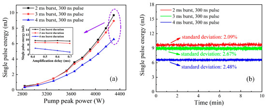 In order to enhance the amplified pulse energy, burst-mode operation was performed with a 300 ns pulse duration at a 0.42 ms amplification delay, as illustrated in Figure 7a. The amplified pulse energy significantly increased with the total injected pump peak power. The maximum pulse energy scaled up to 9.68 mJ, 8.94 mJ, and 6.57 mJ at a pump peak power of 4300 W with respect to the pre-shaped output. As a longitudinal comparison, the enlarged pulse energies for the 2 ms and 3 ms envelope durations possessed similar distributions until separating at the nearly maximum pump peak power. Furthermore, such a trend showed a breakdown as the envelope width expanded to 4 ms due to serious gain deterioration. The inset demonstrates the variation in the maximum pulse energy versus the amplification delay for different envelope durations. Correspondingly, there was no obvious output fluctuation at 2 ms and 3 ms envelope durations when increasing the amplification delay to 0.7 ms. However, a faster drop occurred for the 4 ms burst profile, which could reflect the model’s susceptibility to thermal imbalance from the side to some extent over longer envelope durations. Figure 7b presents the operation stability of the pulse burst laser with the maximum output in 10 min. The standard deviations of the system’s operation were 2.09%, 2.67%, and 2.48% in terms of the 2 ms, 3 ms, and 4 ms burst durations, respectively, indicating the relatively stable operation of our burst-mode laser system.