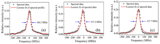 The output spectral profile of the pre-shaped beam was measured by utilizing a scanning Fabry–Perot interferometer at full pump energy over a 4 ms burst envelope and a variable pulse duration. From Figure 8a–c, the measured spectral bandwidth, FWHM of Lorentz fit was 68.3 MHz, 67.2 MHz, and 67.7 MHz, corresponding to pulse durations of 100 ns, 200 ns, and 300 ns, respectively. Also shown is the convolution of the Fabry–Perot cavity mode and Fourier transform of practical temporal beam of the MOPA output. In addition, a longer pulse could result in narrower bandwidths, as defined by Heisenberg’s uncertainty principle [34]. For this work, the measured spectral linewidth approached the resolution (67 MHz) of the Fabry–Perot interferometer with a free spectral range (FRS) of 10 GHz. Hence, a precise interferometer with higher resolution could better distinguish the spectral profile for more accurate spectral linewidth characterization.