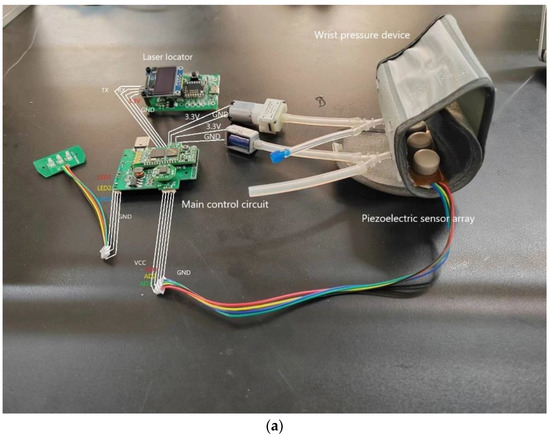 With the development of sensor technology and the rise of artificial intelligence, modern medicine tends to analyze human health status by collecting pulse signal waveforms at the radial artery through miniaturized and intelligent precision instruments [8,9,10,11,12,13]. In 1860, the Frenchman Etienne Jules Marey developed the pulse tracer [14], which depicted the pulse signal at the radial artery by tracing points through the mechanical principle. However, the pulse tracer was bulky, difficult to use accurately, and difficult for patients to accept. With the development of electronic technology, a variety of pulse signal detection systems with high accuracy have been designed. For example, Chen C, Sun Y et al. [15,16,17] used the principle that the voltages at the two ends of the resistors in the bridge were different under different pressures to package multiple piezoresistive sensors with the same type and size through special materials, and then the wires were bonded and electrically connected to the PCB board to form a sensor array, and a special material coating was added to form protection. Signals were collected at various positions on the radial artery axis at the same time. However, the classification of pulse waveforms is not carried out by machine learning algorithms. Chen Y. Y el et al. [18] used the principle of photoelectric reflection method to attach the photoelectric sensor to the radial artery on the surface of human skin to obtain the radial artery’s signal. However, most studies use optical sensors without pressurized structures, which makes it impossible to simulate the measurement method of traditional Chinese medicine to obtain pulse signals. Liu S et al. [19] detected the pulse signal at the radial artery through the hardware circuit design of the flexible circuit board combined with the tactile sensor attached to the wrist, which prevented the reverse pulse signal waveform to a certain extent. However, the research on covering the key points of the radial artery through the arrangement of the sensor array requires further intelligent positioning of the Cun, Guan and Chi. Lee Y et al. [20] placed an ultrasound probe at the human radial artery and achieved the acquisition of pulse signals by Doppler ultrasound technology. However, it is necessary to manually mark the positions of Cun, Guan and Chi obtained from the pulse diagnosis of traditional Chinese medicine, and measure the ultrasonic wave and pulse wave with a thin line wrapped around the marked measurement position. The current research [10,21,22,23] mainly realizes the detection of pulse signal waveform at the radial artery through the development of the piezoelectric sensor, but it is difficult for the polyvinylidene fluoride (PVDF) piezoelectric sensor to maintain consistency when the force is small, and the charge disappears faster under static force. The collected pulse signal has noise, and the pulse signal needs to be further denoised by software to make the pulse condition recognition more accurate.