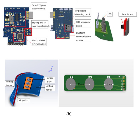 The hardware of this system is composed of the main control circuit, the new piezoelectric sensor array, and the wrist pressure device, as shown in Figure 1. The main control circuit of the system takes STM32F103C8T6 chip as the core, including four 12-bit AD acquisition circuits, XGZP6847A air pressure sensor, SC300IPN micro air pump and EVS-HD-3003 solenoid valve composed of air pressure detection and pressure circuit pressure detection and pressure circuits, laser positioning module composed of an ADNS-9800 chip, power management circuit composed of FM3209 chip, indicator circuit, HC-05 Bluetooth communication circuit, which realizes analog to digital signal conversion, wrist band pressure control, sensor displacement measurement, and Bluetooth data communication. The wrist pressure device is composed of an inflatable wristband, an air bag, radial stem bone ferrules, air filling and discharging ports, and corresponding hoses, which has the characteristics of small volume, fitting wrist skin and good air tightness. The new piezoelectric sensor array is composed of three 11 mm diameter cylindrical silica gel packaged new piezoelectric sensors arranged at an interval of 15 mm and integrated on a flexible circuit board, it can simulate the person’s index finger, middle finger and ring finger in the close state, which can effectively cover the corresponding position of Cun, Guan and Chi, so as to realize the acquisition and amplification of weak pulse signal.