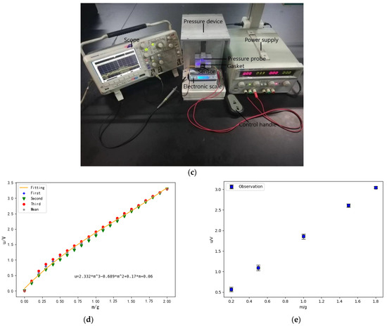 The working principle of the new piezoelectric sensor: (a) composite material; (b) sensor internal circuits; (c) experiment device; (d) piezoelectric effect; and (e) error analysis.