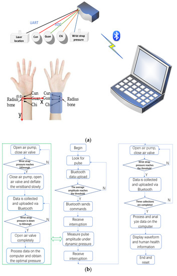 Finally, the system pressured the wrist band to 60 mmHg, 80 mmHg, 100 mmHg through the air pump, three pulse signal data and one wristband pressure value were collected by four-channel ADC with a sampling frequency of 125 Hz similarly, the data were uploaded to the computer by Bluetooth for noise reduction, feature extraction and analysis. Thus, the pulse signal waveform under three static air pressure, the recognition results of the slippery pulse and the normal pulse, and the analysis of human health state were obtained. The system acquisition process is shown in Figure 3: