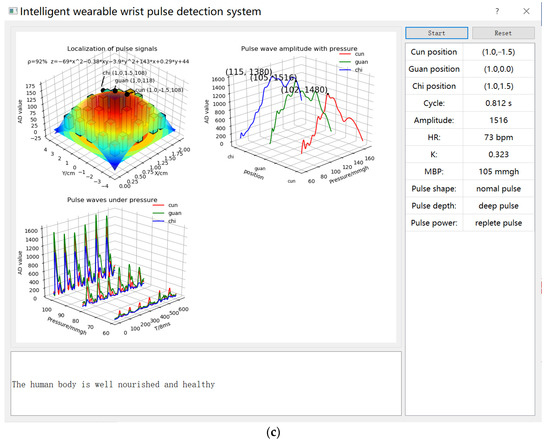 In conclusion, the wrist pulse acquisition system is feasible, and has the characteristics of small size, accurate pulse positioning, good noise reduction effect, and accurate intelligent analysis. It is suitable for different groups of people and meets the needs of family health care. In the future, we would integrate the accelerometer and gyroscope into the wearable system to effectively detect the arm’s motion state and eliminate the inhibitory motion artifacts. At the same time, more experiments will be carried out on the basis of traditional Chinese medicine to perfect the pulse database, and the relationship between pulse condition and human health status will be established through machine learning, and the patients with different diseases and healthy personnel can be classified and identified precisely, which is of great significance for the objective research of traditional Chinese medicine pulse diagnosis.