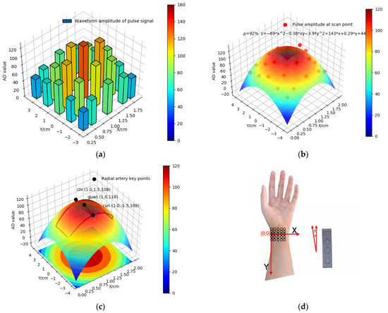 The principle of adaptive pulse finding. (a) Scan of fixed positions of the wrist; (b) the relationship between amplitudes and positions of the pulse signal; (c) radial artery key points location; and (d) deployment of the sensor array.
