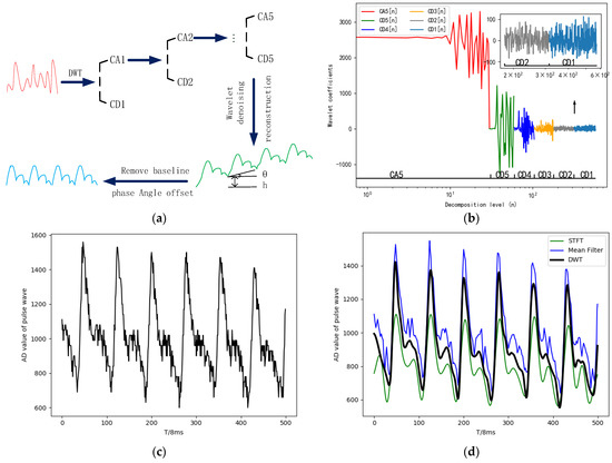 In Formula (7), and are the sampled signal and window function, is the short-time Fourier transform signal. In Formula (8), is the pulse signal before wavelet decomposition, is the wavelet function coefficient, is the scale function coefficient is the scale component, is the detail component. In Formula (9), is the threshold and is a constant. In Formula (10), is the angle between the connecting line and the horizontal line of the starting point and the ending point of the single period pulse, is the pulse signal processed by discrete wavelet transform (DWT). In Formula (11), is the period of pulse signal, is the singly periodic pulse signal with the phase angle offset removed, and is the singly periodic pulse signal with the baseline drift removed. The wavelet transform and iterative sliding window processing of pulse signal are shown in Figure 5: