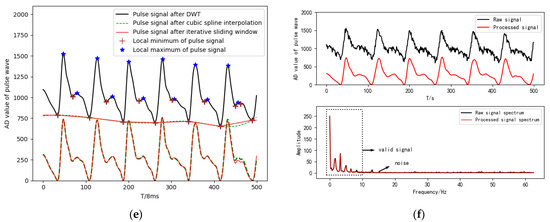Wavelet transform and iterative sliding window processing of the pulse signal. (a) The pulse signal preprocessing flow; (b) Wavelet decomposition of the pulse signal; (c) Raw signal; (d) Hardware circuits noise removal; (e) The baseline and the phase angle offset removal; (f) Amplitude-frequency characteristics of the pulse signal.