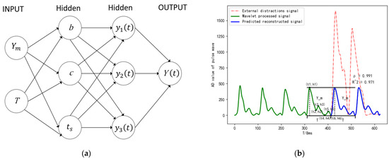 After wavelet transform and iterative sliding window processing, the mixed waveform which contains external interference in the pulse signal and some waveform amplitude and period mutations is predicted and reconstructed according to the pulse waveform of the last period. The waveform reconstruction by curve fitting requires a large number of signal sampling points, and the algorithm complexity is high. The pulse waveform is a composite waveform formed by superposition of main wave, tide wave and dicrotic wave according to frequency and modal reconstruction. Firstly, the main wave is analyzed by regression analysis according to the peak and the period , as shown in Formula (12), combined with the corresponding curvature of the main wave, as shown in Formula (13), and the waveform of the main wave is obtained, as shown in Formula (14). Then, the waveform of the tidal wave can be obtained by regression analysis based on peak and period , as shown in Formula (15). Then, the waveform of the dicrotic wave can be obtained by regression analysis based on peak and period , as shown in Formula (16). Then, the spatial and temporal domain relationships of the predicted main wave, the predicted tidal wave, and the predicted dicrotic wave are obtained in turn by the height of the peak and the trough of the main wave, tidal wave and dicrotic wave of the pulse signal of the last period , and the occupied period , as shown in Formula (17). Finally, the predicted main wave, the predicted tidal wave and the predicted dicrotic wave are superimposed in the period T and deployed to the corresponding position, as shown in Formula (18), and the predicted and reconstructed pulse signal waveform is obtained.