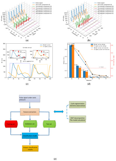 The difference in waveform between the sliding pulse and the normal pulse is the absence or presence of the dicrotic wave. Due to the influence of human factors, there is a condition in which the dicrotic wave are inconspicuous in the collected pulse signal waveform. The extreme value extraction method is used to determine whether the pulse signal waveform contains dicrotic wave, which leads to the inaccurate identification of the sliding pulse and the normal pulse, thus affecting the analysis of human health status. We commissioned Shanghai Bayes Health Technology Co., Ltd., Shanghai, China, to collect the pulse of 140 subjects from various TCM clinics through this system, including 100 healthy men and women aged 20–30 years, 30 men and women aged 20–30 years who were in the state of cold or fever, and 10 women aged 20–30 years who were in pregnancy. A total of 1260 sets of corresponding pulse signals were divided into the normal pulse and the slippery pulse labels. Then the pulse dataset was randomly shuffled and rearranged, of which 60% was used as the training set, 20% was used as the validation set, and 20% was used as the test set. Through the feature extraction and classification algorithm, this system first extracts the spatial-temporal features and the modal energy features of pulse signal, and then uses the machine learning method to train the classification model to identify the slip-pulse and normal pulse, so as to realize the accurate analysis of human health status. The principle of feature extraction and classification is shown in Figure 7: