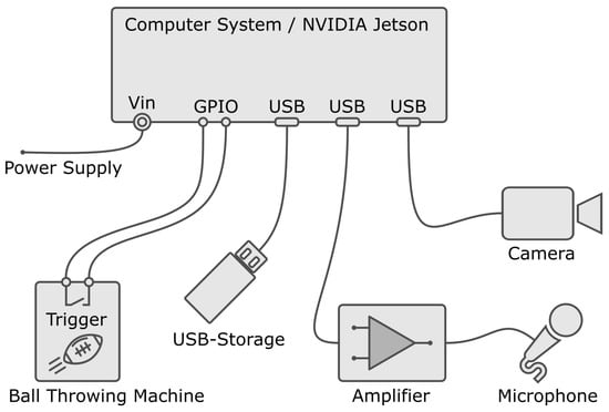 To train the neural networks, a recording system is needed for data acquisition. This system should independently record and store an audio and video sequence of an athlete during a catch attempt via an external trigger. The recording system is integrated into the passing machine [29,30], which triggers the start of the recording. A camera and a microphone with a directional pattern are mounted on the ball-throwing machine. After triggering, an audio sequence and an independent video sequence are recorded. An overview of the recording system is shown in the system topology in Figure 1. The central point of the system is the computer system. The camera, the microphone with the amplifier, the external USB memory storage and the trigger contact of the passing machine are connected to it.