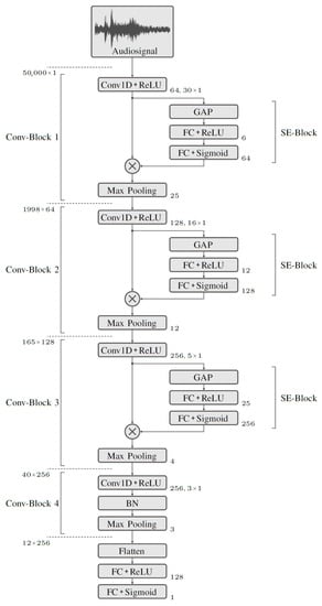 The classification whether a record belongs to the class Drop or to the class Catch is performed with a first model purely based on the audio recordings. For classification, a model architecture with several Convolutional layers connected in series and a fully meshed output layer is used. An overview of the network structure of this model is shown in Figure 3. The input to the model is the audio signal in the form of a one-dimensional tensor with 50,000 elements. This is followed by four convolutional blocks, Conv-Block 1 through Conv-Block 4. These are used to extract signal features. The final classification is performed using Fully Connected (FC) layers. The special feature of Conv-Block 1 to Conv-Block 3 is the downstream Squeeze and Excitation (SE) block. Ref. [51] demonstrates that SE blocks provide significant performance improvements with little additional computational overhead. The model is trained with the training dataset. Since the classification is binary, the Binary Crossentropy loss function is chosen. As an optimization function, for updating the weights during training, Adam [52] is used. The batch size is set to 5. During training, the learning rate is adjusted after each epoch. The best results are obtained with an initially higher learning rate of 1 × 10−5, which decreases linearly over 20 epochs to 8 × 10−6. This is kept stable over 40 epochs and then exponentially reduced to 2 × 10−6.