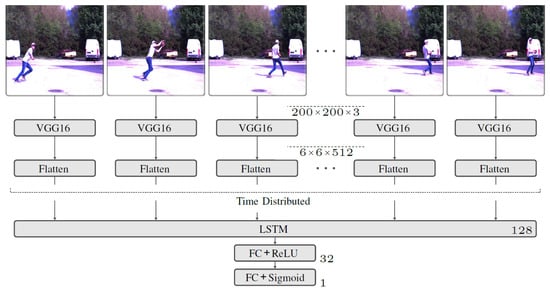 A CNN is used to extract the features contained in the individual images. However, since training a CNN to classify image data requires a very large dataset to achieve high accuracy, pre-trained network is used for feature extraction. Specifically, the VGG16 [45] Network is embedded. This is a very compact mesh with relatively few parameters. The network was developed to classify images and has been used with 1.28 × 106 Images trained on 1000 classes. It gives very good results on the ImageNet dataset. Since a video consists of multiple frames, feature extraction is applied to all frames separately using TimeDistributed function. The output of the feature extraction has an additional dimension that describes the temporal flow of the extracted features. An LSTM is used to account for temporal dependencies between the extracted features. The network structure of the implemented model is shown in Figure 4.