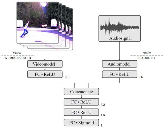 The pre-trained models for audio and video classification were integrated and linked into a third model. This should lead to higher accuracy in the classification of the data, since the entire dataset with the audio and video source is used for the prediction. The network structure shown in Figure 5 provides an overview of the model. The video data are processed using a model branch with the video classification model already trained. The input tensor of the video data has the same size as the input tensor of the video classification model.
