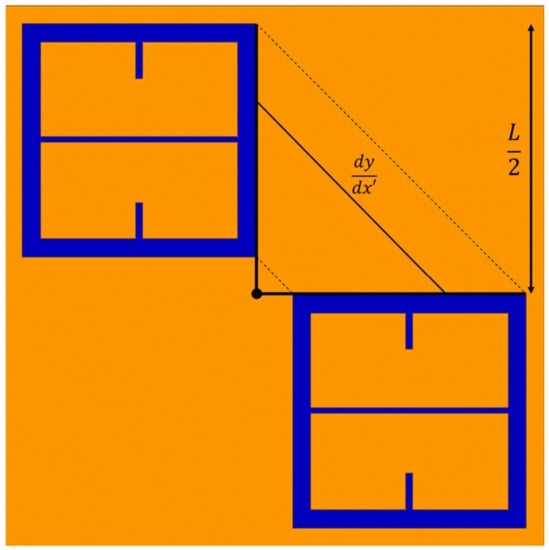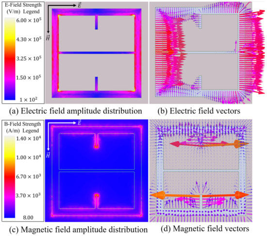 In Equation (4), is the average distance between two active components within the unit cell, P is the lattice period, and are the effective permittivities of the substrate and the material directly above it, respectively, and is the permittivity of free space. The value of the capacitance of the RLC circuit is an essential parameter, for it is solely responsible for changing the position of the resonant peak of transmittance spectra between active circuit ports in frequency alone.