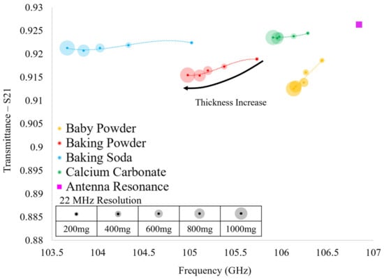 Figure 13). However, they do agree with one another in that a decrease in relative resonant frequency shifts between successive powder layers is observed as the layer thickness increases (with the exception of baking soda). In further agreement with theory, the greatest relative shift in resonant frequency between adjacent resonant points of the same species is observed when increasing the layer thickness from 0 mg to 200 mg, as was observed in the experiments, indicating that the device is sensitive to minute changes in the ambient environment.