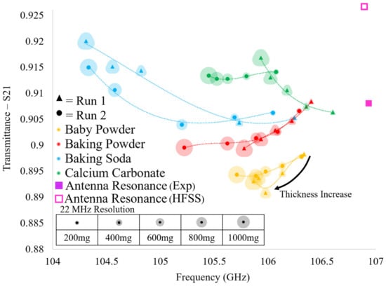 In comparing the two experimental runs, it is clear that there are similarities and differences between identical powders, but there are still unique characteristics belonging only to powders of the same species. For instance, calcium carbonate and baking soda both reliably produced transmittance spectra which rose above the bare antenna resonance values. However, spectra produced in HFSS using Maxwell Garnett effective medium theory and average effective thicknesses never produced a transmittance amplitude that surpassed the bare antenna peak. Furthermore, baking soda produced an interesting result in the experiments: in Run 1 there is a large jump in resonant frequency and transmittance amplitude from the 200 mg layer to the 400 mg layer and a similarly perplexing jump from the 600 mg layer to the 800 mg layer in Run 2 (diverging from the pattern observed in simulation and distinct from the other powders’ spectral evolution observed experimentally).