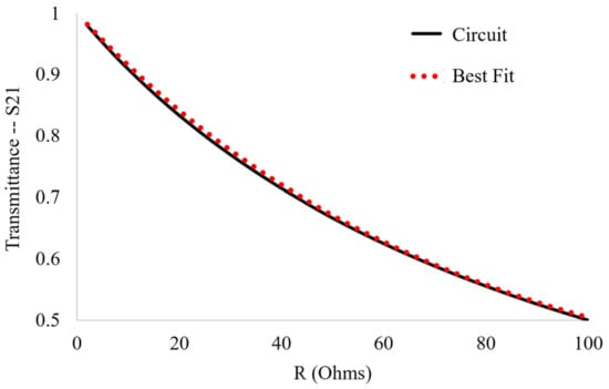 R given any maximum transmittance amplitude through the metasurface–powder interactions. The graph and best fit of the transmittance vs. resistor value for the fundamental circuit, given by Equation (9), is presented in