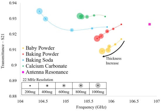 Figure 13, each point represents the maximum transmittance amplitude and the corresponding resonant frequency of each of the acquired transmittance spectra. It is clear that there are distinct differences in the evolution of the transmittance spectra between the four powders tested as a function of layer thickness. However, important similarities are observed between alike powders between successive runs, demonstrating the reproducibility and distinguishability of the proposed sensing technique. Furthermore, although we acknowledge that the relative shifts in transmittance amplitude between successive powder layers are relatively small, we suggest that this technique shows that the scale of the relative shifts in resonant values are not of great importance. We propose one must consider the resonant transmittance values of more than one powder layer on the metasurface before attempting to identify a particular powder. In so doing, one may consider each of the data points as an individual member of a distinct resonant spectral evolution belonging to a specific powder.