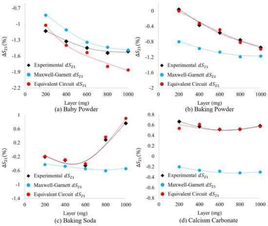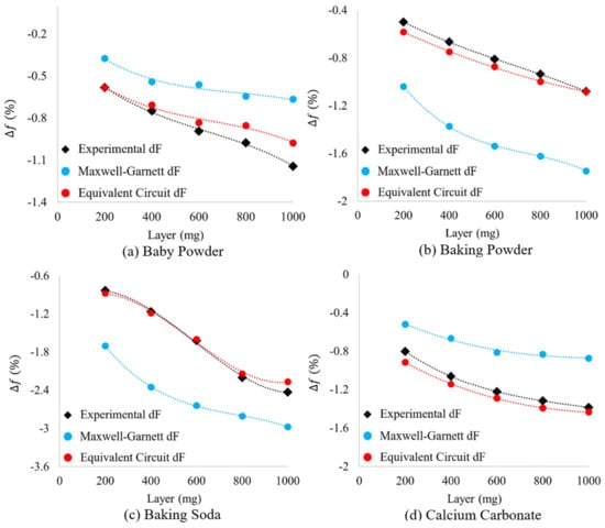 Table 8. Since the value of the inductor is held constant (1.35 nH) in this study, one can plug in the shifted resonant frequency values (found after solving Equation (10) for each powder layer) into Equation (8), and the effective value of the capacitor, C, can be found for each powder layer. Then, by plugging