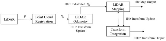 LOAM (lidar odometry and mapping in real time) is a high-precision and real-time positioning and mapping algorithm based on 3D LiDAR proposed by Ji Zhang et al. [21,22]. The core of the LOAM framework is in two parts, a high frequency odometer and low frequency mapping, as shown in Figure 1.