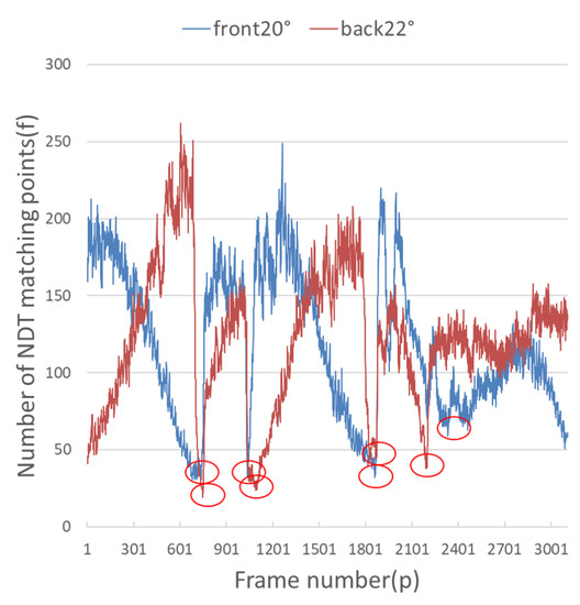 It can be seen from Figure 9 and Figure 10 that when the number of NDT matching points is less than 100, the relocalization error will increase sharply, and when the number of NDT matching points is less than 50, it is extremely easy to lose positioning. The theoretical value for the number of NDT matches per frame is set to 100. Since the number of NDT matching points is 3109, the number of NDT matching points is 249,2189. Therefore, the number of NDT valid matches cannot be less than 12.4% of the total number, and the number of single-frame NDT valid matches cannot be less than 100. However, the complexity of the road sections (there are straight sections and curved sections) led to the fluctuation of NDT matching points in terms of the volume of the point cloud frame. According to the actual experiment, a reliable range was obtained, which was 14.7% to 16.3%, as shown in Table 4.