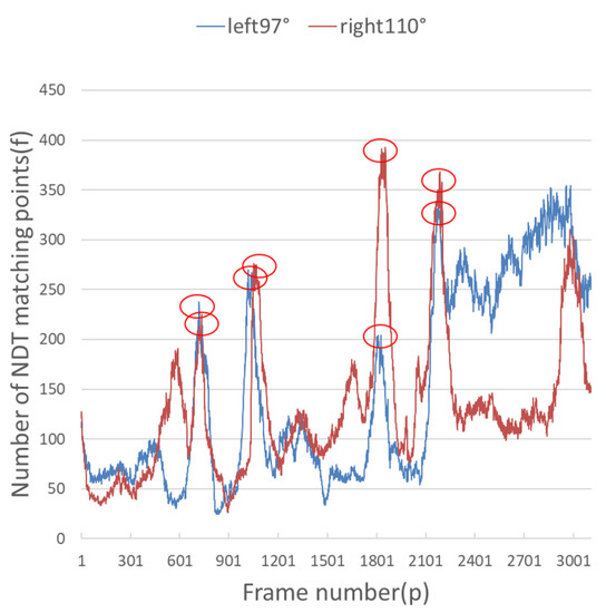 It can be seen from Figure 9 and Figure 10 that each group of data has four turning points with great changes. As shown in Figure 11 and Figure 12, as the vehicle turns, the number of LiDAR-effect matching points on both sides decreases dramatically, resulting in reduced repositioning accuracy, as shown in Figure 13 and Figure 14. The LiDAR field of view on the left and right sides becomes larger, and the number of effective matching points increases dramatically, resulting in higher repositioning accuracy, as shown in Figure 15 and Figure 16.