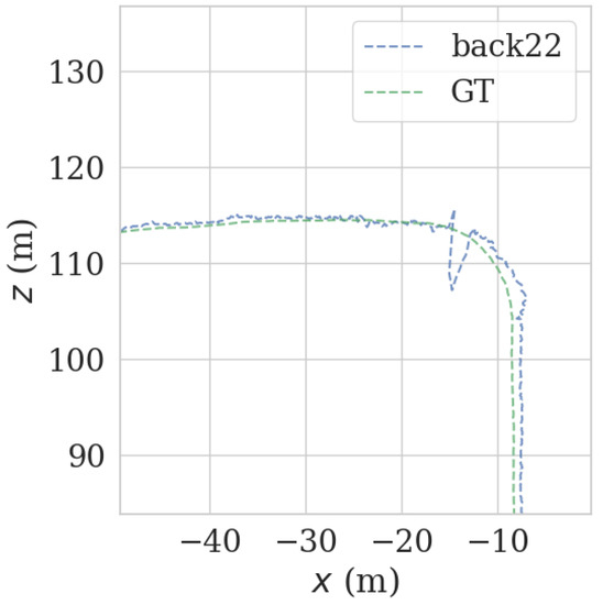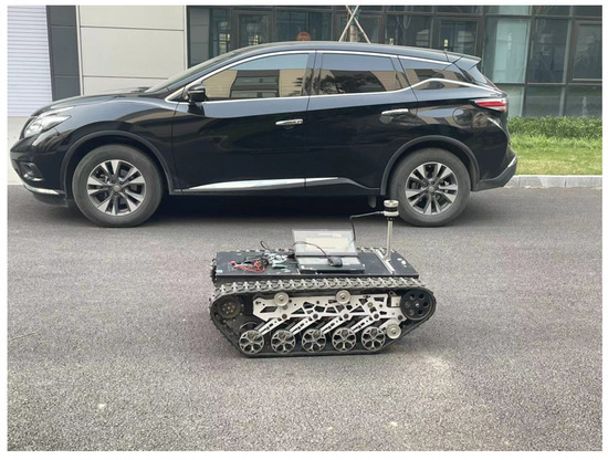Tracked vehicles equipped with 64-line LiDAR are used in real environments, as shown in Figure 7. The LiDAR used here was the Ouster OS1-64, with a measurement range of 150 m, an accuracy of ±2 cm, a vertical perspective of 30°, a horizontal perspective of 360°, a vertical angle resolution of 0.52°, a horizontal angle resolution of 0.09°, and a rotation rate of 10 Hz. The test was conducted in a complex urban environment with obvious characteristics. As shown in Figure 8, there were curved roads, straight roads, and obvious large obstacles on the left and right sides of the crawler. The road length in the dataset was 1 s and the duration was 23 s. All evaluation experiments were run on a computer with an AMD R7-4800H processor, 16 GB RAM, and a single NVIDIA GeForce GTX1650ti GPU.