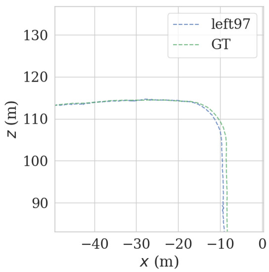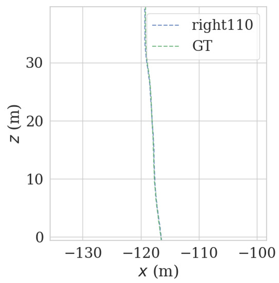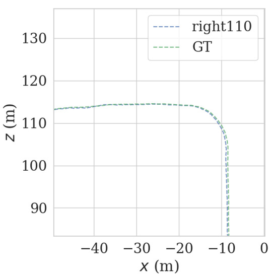 In order to further explore the effect of the LiDAR-matching point cloud orientation and the number of NDT matching points on the positioning accuracy and weight in the point cloud, the influence of the positioning trajectory drift is extended in the middle of 90° to 270° on the left and right. Experiments are carried out at different angles at 30 degrees. As shown in Table 2, by comparing the number of NDT matching points on the left and right sides of the LiDAR, it can be seen that due to the large number of NDT-matching point clouds at the front and the back, and at 90°–270° on the left and right sides, at 1°, the proportion of the number of matching points before and after NDT plays a decisive role in the accuracy of the positioning trajectory. At the same time, it is also proved that the more NDT matching points there are, the higher the positioning accuracy and the smaller the degree of drift. In normal driving mode, since the point clouds at the front and back of the radar point cloud are relatively abundant, it is recommended to use the front and back point clouds more.