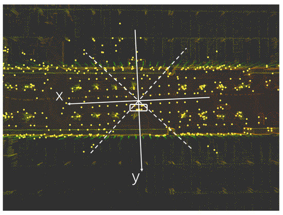 The positive direction of the x-axis is the front of the LiDAR, and the positive direction of the y-axis is the left side of the LiDAR, as shown in Figure 2. Different LiDAR point cloud areas are extracted through the ROI (area of interest), and LiDAR point cloud areas of different sizes are reserved at the front, back, left, and right to simulate the changes of the LiDAR field of view in different degrees. The ROI can be delineated for further processing. The LiDAR point clouds in each region can be described as: