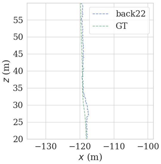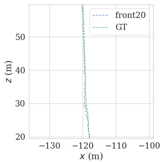 As shown in Figure 17 and Figure 18, in the normal, straight-line segment, obstacles were distributed unevenly and close by. It is easy to reduce the left and right LiDAR field of vision, resulting in a number of NDT-effective matching points between 50 and 100, resulting in reduced relocation accuracy, or even loss of location. In the normal, straight-line segment, since most of the front and back LiDAR data were ground points, the relocation accuracy was seriously affected. The left and right LiDAR points were mostly effective feature points with rich features. As shown in Figure 19 and Figure 20, in the straight-line segment, the positioning accuracy of the LiDAR data on the front and back sides was poor. As shown in Figure 21 and Figure 22, the positioning effect of the LiDAR data on the left and right sides was good.