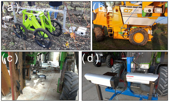 The sensor was designed to simplify the integration with different vehicles; some examples are shown in Figure 3. As the agricultural machines do not feature standardized mounting points for sensors, specific mounting systems needed to be created for every vehicle, whether it was traditional agricultural machinery (Figure 3b–d) or custom robots (Figure 3a). The use of steel channels could also be necessary in order to adjust the camera field. Given the variability of situations and machinery in the agricultural world, we believe this is an unavoidable issue when working with different vineyards. It is also worth noting the sensor could not be mounted on a vehicle and could be used as a pedestrian system (using a custom cross-shaped steel beam support), allowing quick experiments in the vineyard.