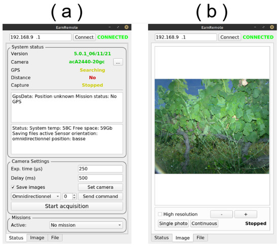 The sensor could also be controlled manually using a remote Wi-Fi connection. An Android smartphone application was developed (Figure 4), which connected to the sensor. The user interface was exhaustive, showing the status of every component (Figure 4a), the live captured image (Figure 4b), free storage space and other information. It also allowed us to start and stop the acquisition manually and to set the camera parameters, such as exposure time and frequency, as well as managing the data (deleting, copying to or extracting on a USB device, updating the software tool, etc.).