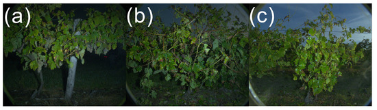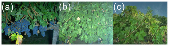 Examples of framing differences on grapevine acquisitions. (a) Bottom part and trunk of the vine. (b) Leaf area of the vine. (c) Top part of the vine. Images extracted from the 4 projects’ datasets.