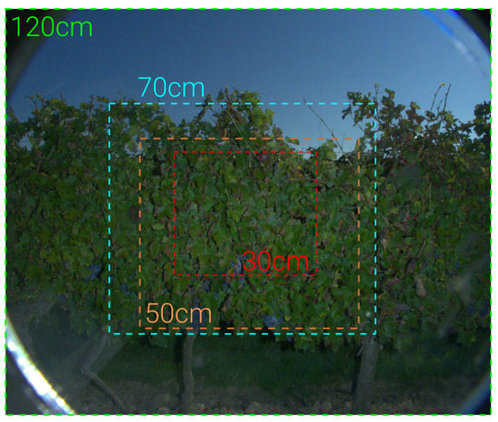 where f is the focal length (mm), s is the height of the sensor (mm) and h is the physical height of the object (mm). Using this formula, it is easy to compute the recommended distances to achieve a proper framing in a vineyard, as illustrated in Figure 6. For instance, if d = 50 cm, a surface represented by the orange dotted square can be covered. In that case, most of the foliar area can be sampled. However, this does not guarantee perfect framing, since any vertical shift from this perfect configuration will make it subpar.