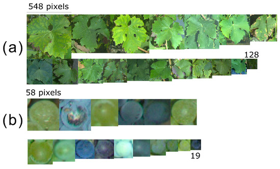 Another important consequence of the framing variability is the objects’ size variability in the resulting images. Even though image size is constant, objects appear bigger when the camera is close to the plant. That, however, does not necessarily mean they are easier to detect for the trained algorithms. If we add to this variability the natural seasonal variability (phenological stages BBCH71 through BBCH89 in the case of grapevine berries [36]) and cultivar differences, huge differences are to be expected. As a small visual experiment, Figure 7 presents a set of sample square patches of leaves (Figure 7a) and berries (Figure 7b) extracted from all the study projects.