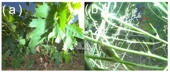 Another consequence of noncontrolled environments is the possible inclusion of abnormal objects in the field of the camera, or normal objects obstructing the field. Occlusion is bound to happen, especially when the camera is mounted on the lower part of the acquisition vector (e.g., harvesting machine). Weeds (Figure 8b) or even sometimes full leaves (Figure 8a) may obstruct the object of interest. Processing of the picture then becomes more difficult, or even impossible in some cases.