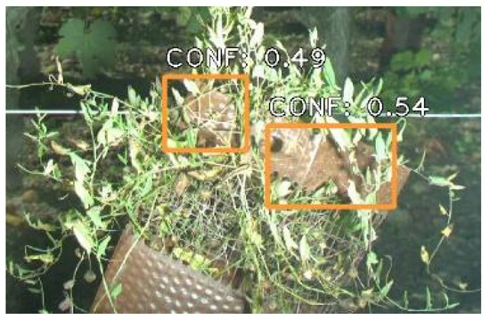 Depending on the algorithm and the training base, abnormal objects may also trigger false positives. An example of this phenomenon is shown in Figure 9. In that case, the objective was to differentiate esca symptoms from other grapevine symptoms and deficiencies (for instance, dried leaves). Here, an abnormal brown object filled with weeds was wrongly detected as two dried leaves. This was not a surprising error since no such objects were present in the training set. It is wise to expect many other potential false detections of this kind are possible. An algorithm may for instance detect pheromone dispensers as dried leaves, even though it did not happen in our studies.