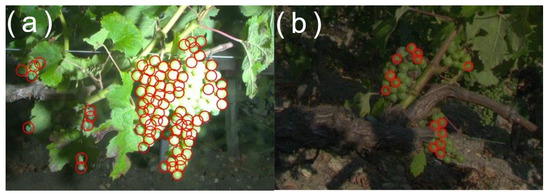 Example of results from the EARN dataset for the detection of berries (red circles). (a) Example of overexposed picture with undetected berries. (b) Example of a picture with no flash, showcasing undetected berries.