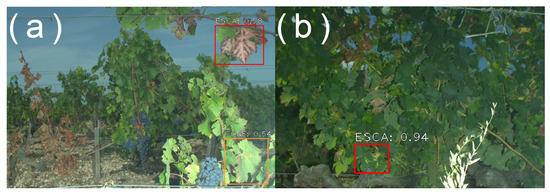 Example of detection results from the ADVANTAGE esca disease dataset. Red boxes: esca detections. Orange boxes: other symptoms and deficiencies detections. (a) Example of good behavior: background-row dried leaves appropriately not detected. (b) Example of bad behavior: background-row esca leaf detected. Figures in both images indicate the algorithm’s confidence.