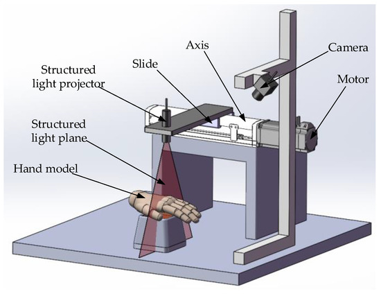 The experimental platform model designed in this paper is shown in Figure 3. The camera and motor-axis platform are fixed together so that the camera’s optical axis passes through the dorsal hand. The structured light projector is fixed on the slide table on the axis so that the structured light plane is scanned perpendicular to the direction of the axis movement.