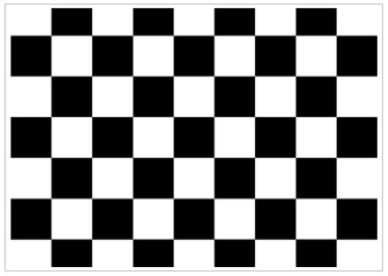 Camera calibration aims to obtain the camera’s internal and external parameters and aberration coefficients to facilitate accurate subsequent calculations. Currently, the camera calibration process has been developed more maturely, and various calibration methods exist. This paper uses the calibration method of Zhang; this method is a simple and flexible operation, and its accuracy can meet the project requirements [32]. In this paper, we chose the 8 × 6 size checkerboard plane calibration board, as shown in Figure 4.